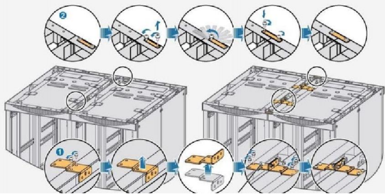 ② Remove the connecting plates on the lintels of the frontand rear 拆除机柜前后门稀的井柜连接板井按图示重新安装。
