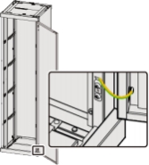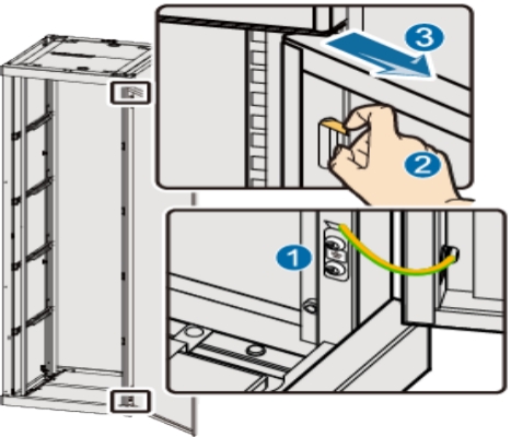 1. 拆除接在机架上的机柜前门和后门的接地线,接地线的另一端保留在机柜门上。 如图3-13中①所示。