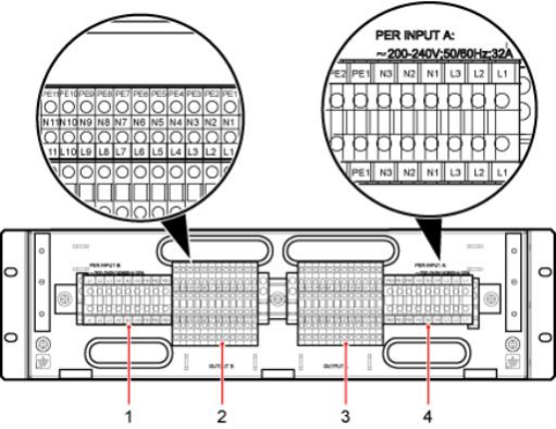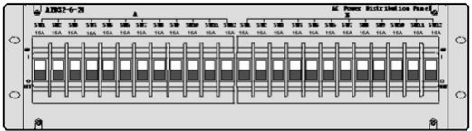 交流配电框前面板上有24个空气开关,分为A和B两组,每组12个,序号SW1至 SW12,均为从左向右排序。每个空气开关的电流为16A。 交流配电框的后面板外观如图3-8所示。