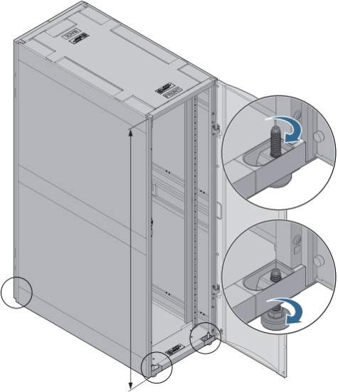 步骤3 用活动扳手顺时针拧四个支撑地脚下部的M12螺栓,确保支撑地脚触地,机柜底部四个 滚轮均悬空,如图3-8中步骤③所示。